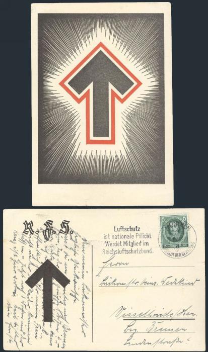 2524 472 image472, Tied by Munich 9 June 1936 slogan cancel "AIR DEFENSE IS A NATIONAL DUTY / BECOME A MEMBER OF THE REICHSLUFTSCHUTZBUND" on a most unusual postcard for the RLB (Civil Air Defense League). The postcard depicts a large ARROW within rays. VF. The first we have seen like this (Image) Estimate 100.00+ $Cdn