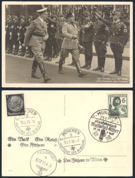2516 415, B116 image415, B116, Tied by two diff fancy Munich cancels April, 1938 on b/w real photo postcard. Depicts ADOLF HITLER & BENITO MUSSOLINI riding together in Hitler's open air touring car. A youth band playing music in the background. VF (Image) Estimate 75.00+ $Cdn