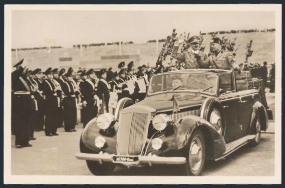 2520 419 image419, Tied by Munich 25 Sept 1939 fancy cancel on b/w real photo postcard depicting BENITO MUSSOLINI & ADOLF HITLER riding together in Hitler's open air touring sedan amid cheering crowds. F, corner creases. Scarce (Image) Estimate 65.00+ $Cdn
