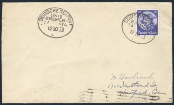 2514 400 image400, Tied by DEUTSCHE SEEPOST / LINIE / BREMEN LA PLATA / 12 Oct 1933 seapost cancel on cover to USA. F-VF (Image) Estimate 50.00+ $Cdn