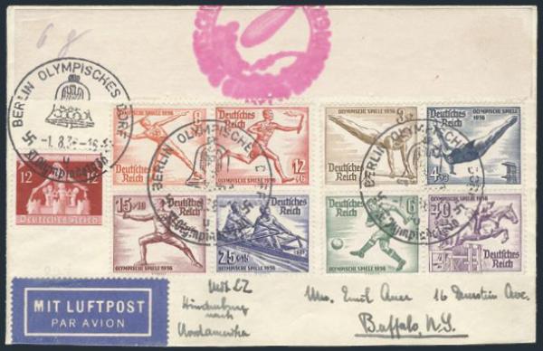 2525 475, B82-9 image475, B82-9, Tied on cach GRAF ZEPPELIN 6th North America Flight 5 Aug 1936 addr to Buffalo, NY. Has Olympic Village cancels & complete semi-postal set. F-VF (Image) Estimate 150.00+ $Cdn