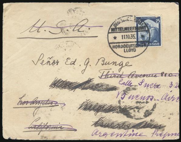 2521 451 image451, Tied by German Seapost 11 Oct 1935 ship cancel on cover addr to Los Angeles, REDIRECTED to Buenos Aires Argentina with 2 Nov b/s. Has ship line logo on flap. F, some flaws, reduced (Image) Estimate 50.00+ $Cdn