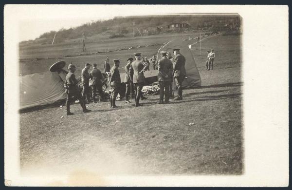 real photo postcard circa 1918 depicting the WRECK OF A WWI FIGHTER PLANE. Shows a group of military Officers and workers surveying the wreck. F. Scarce (Image)