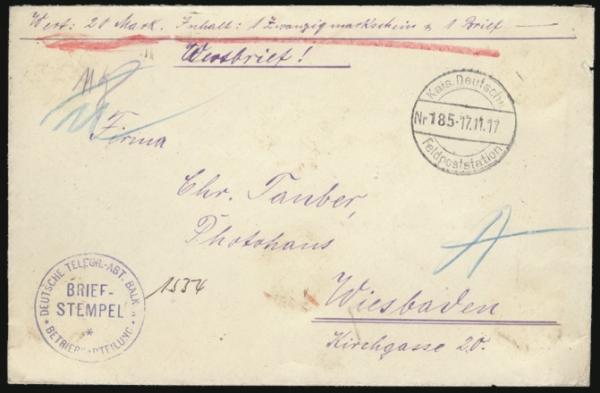 stampless Military money cover with German FPO #185 cancel 17 Nov 1917 to Wiesbaden. Has violet "German Telegraph / Balkans" b/s (from Bulgaria). On reverse has 5 black "F.G." black wax seals. F (Image)