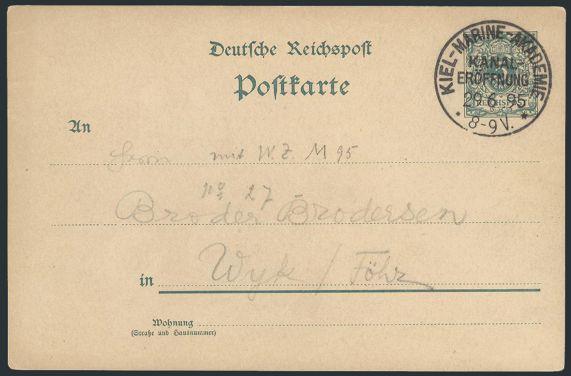 Postal Stationery card with crisp "KIEL-MARINE-AKADEMIE / KANAL - EROFFNUNG 29 June 1895" cancel to Wyk. VF. Scarce postmark (Image)