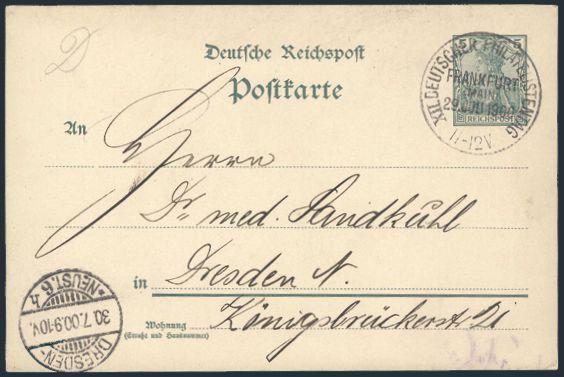 Postal Stationery card with scarce "XII DEUTSCHER PHILATELISTENTAG / FRANKFURT / MAIN 29 July 1900" cancel to Dresden. F-VF (Image)