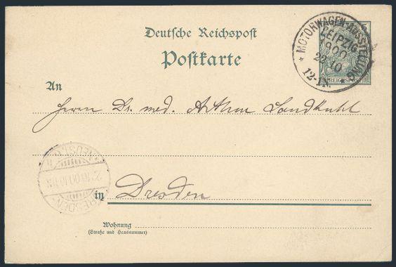 Postal Stationery card with scarce "MOTORWAGEN-AUSSTELUNG / LEIPZIG / 22 Oct 1900" cancel to Dresden. F-VF. VERY SCARCE EARLY AUTO EXHIBITION POSTMARK (Image)