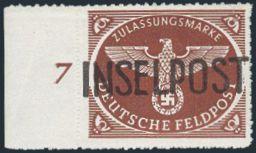 margin # "7" single with local Leros "INSELPOST" Type I 1945 overprint. VF, NH. Uncertified (Mi #11 FP Ba, Cat 4,500 Euro) (Image)