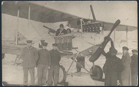 b/w real photo postcard depicting a 2-man armed biplane with ground crew around the plane. F. Scarce (Image)