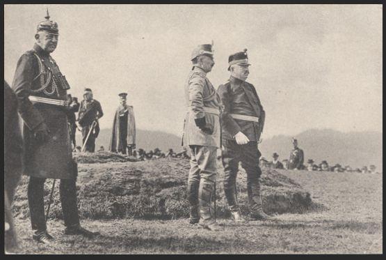 photo postcard circa 1910 depicting KAISER WILHELM and GENERAL MOLTKE along with Swiss GENERAL WILLE viewing military field maneuvers in Switzerland. F (Image)