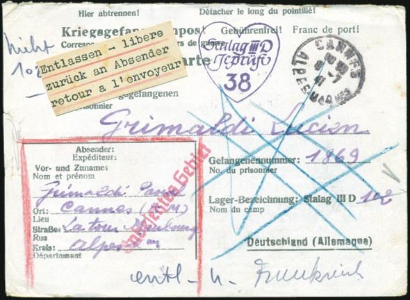 franked German POW reply postcard (reply portion) posted from Cannes 8 July 1941 to STALAG III D, Germany. Has violet heart-shaped Stalag censor h/s. RETURNED with bilingual typed label affixed "released / return to sender". VG-F (Image)