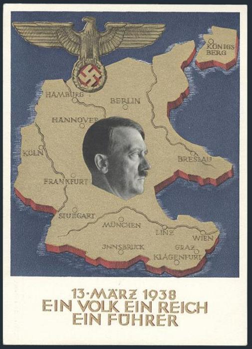 multi-colour Nazi Propaganda postcards commemorating the German annexation of Austria & the Sudetenland in 1938. One is used from Innsbruck Austria. VF, unaddr (2)