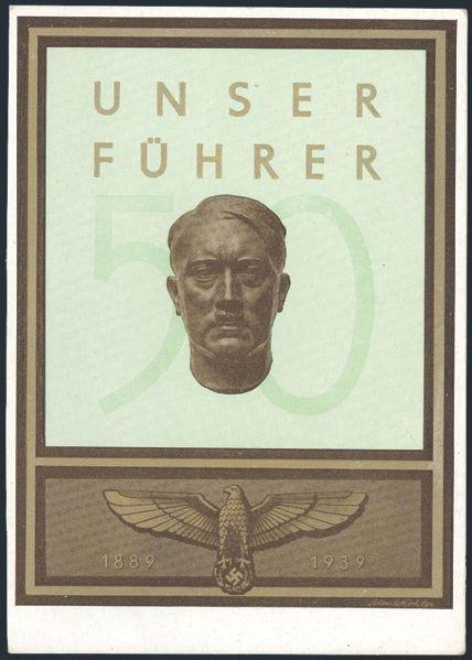 multi-colour Propaganda postcard depicting bust of ADOLF HITLER, Nazi emblem, etc. celebrating his 50th Birthday in 1939. VF, unaddr (Image)