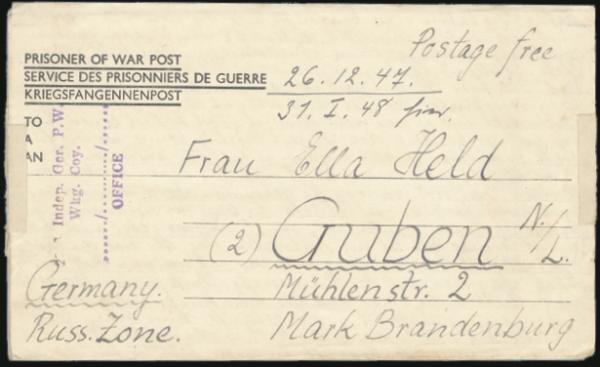 correspondence on 7 free frank POW cards & 3 letter sheets from a German POW at BENGASI, from June 1947 to June 1948. All addr to Guben, RUSSIAN ZONE (on Polish border). Interesting study lot for WWII historian from a POW still held after the war