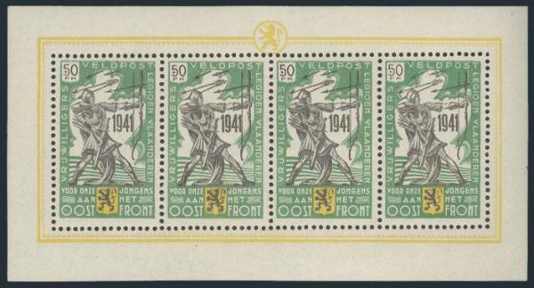 complete set of 4 diff WWII FLEMISH LEGION 1941 locals in sheets of 4. Fresh, VF, NH, two sheets have guarantee b/s's (one minute DG spot in selvedge of one sheet does not detract). Mi #'s I-IV, Cat 2,200 Euro (Image)
