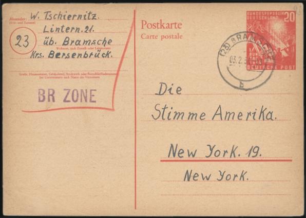 of ten 20pf red Reconstruction issue postal stationery cards from 1949. Each with a diff cancel, all addr to Voice of America, New York. F-VF, some toning as usual
