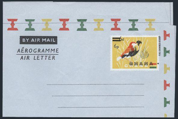 2712   imageUnused 6p on 6d bird illustrated Aerogramme, 1965. Has a MAJOR SHIFT of BLACK COLOUR to right. Looks like 2 birds. VF (Image) Estimate 50.00+ $Cdn