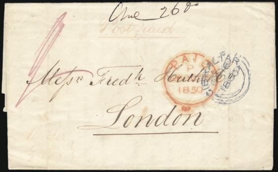 2714   imageStampless letter with blue Gibraltar 16 Oct 1850 CDS to London. Has red "PAID" 26 Oct London receiver, attractive red wax seal, red m/s rate & beautiful calligraphy. F (Image) Estimate 100.00+ $Cdn