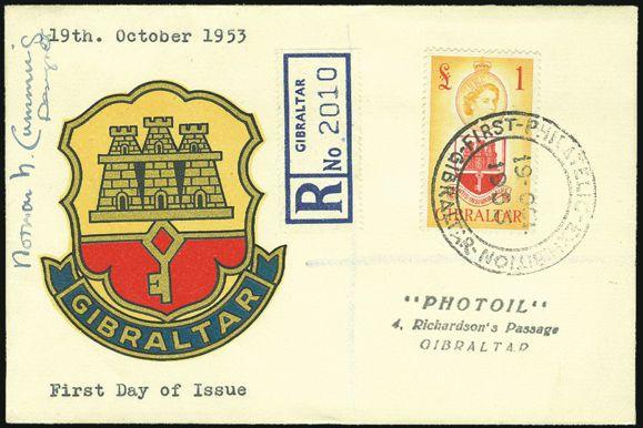 2746 145 image145, QE £1, Tied by 'First Philatelic Exhibition 19 Oct 1953' fancy cancel on gorgeous cach FDC depicting coat-of-arms. Autographed by DESIGNER N. CUMMING. VF (Image) Estimate 150.00+ $Cdn