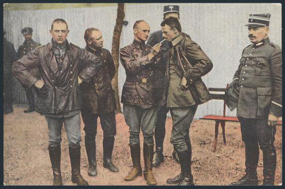 2763   imageMulti-coloured WWI postcard depicting GERMAN CREW MEMBERS OF A DOWNED GERMAN ZEPPELIN AIRSHIP IN SALONICA AT THE VARDAR RIVER. Shows the crew of 4 German Airmen (who are very defiant looking) surrounded by Military officers. Has 1917 message on reverse but not mailed. F. Scarce (Image) Estimate 75.00+ $Cdn