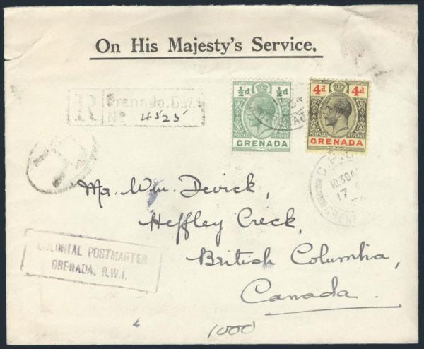 2774 91, 101 image91, 101, Tied by GPO Grenada 17 Oct 1934 CDS's on Reg'd Official cover to Heffley Creek, British Columbia (5 Nov b/s). Has several transits incl C&V RPO & lovely embossed Colonial Crest on flap; plus enclosure. F, minor edge flaws (Image) Estimate 50.00+ $Cdn