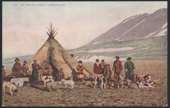 2769   imageUnused coloured postcard circa 1910 depicting an ESKIMO FAMILY & their dogs. VF (Image) Estimate 50.00+ $Cdn