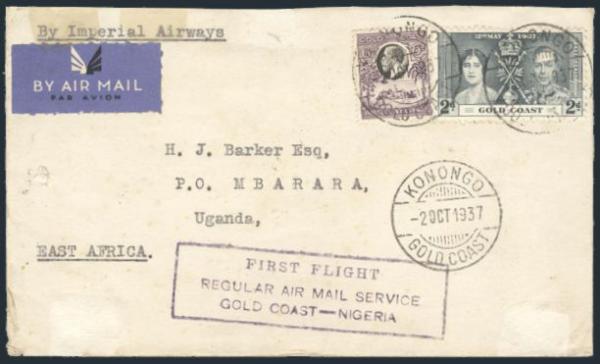 2756 104, 113 image104, 113, Tied on cach Imperial Airways Gold Coast to Nigeria FFC addr to Mbarara, Uganda. Has Konongo, Gold Coast cancel & Sudan Air Mail Khartoum b/s. F, some mounting traces (Image) Estimate 50.00+ $Cdn