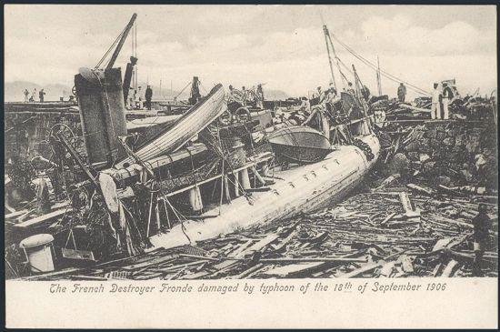 2821   imageUnused b/w postcard depicting the wrecked French Destroyer naval ship "Fronde" following the TYPHOON OF 18 SEPT 1906. Shows the ship partly submerged & completely damaged. VF (Image) Estimate 75.00+ $Cdn