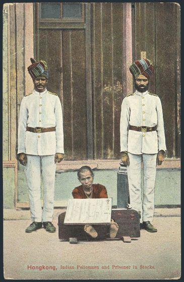 2823   imageUnused coloured postcard circa 1908 depicting INDIAN POLICEMEN & A CHINESE PRISONER IN STOCKS. F, corner crease (Image) Estimate 60.00+ $Cdn