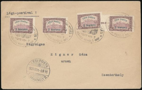 2830 C3 imageC3 (4), Tied by fancy 7 Nov 1920 oval FIRST DAY cancels on airmail cover to Szembathely (next day rec cancel). Has guarantee b/s. VF (Image) Estimate 65.00+ $Cdn