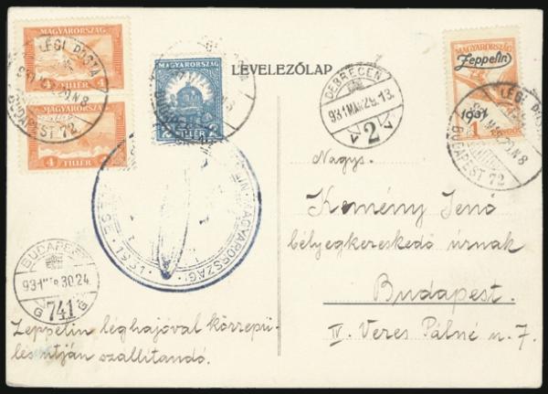 2831 C12 imageC12 (Pair), C24 (Zeppelin stamp), etc, Tied on cacheted ZEPPELIN FLIGHT postcard from Budapest 29 Mar 1931. Has Debrecen CDS. VF (Image) Estimate 100.00+ $Cdn