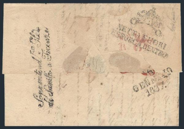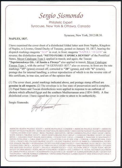 2973   imagePre-stamp DISINFECTED folded letter 1837 from Naples to Livorno with fancy "AGP" dispatch postmark on the face. On reverse has nice b/s's with "Napoli / 10 Gen" and the disinfection mark "NETTO FUORI / E. SPORCA DENTRO" of the Pontifical States, etc. F-VF. Has been signed by Sismondo & with his 2012 Certificate (Image) (View Certificate)
