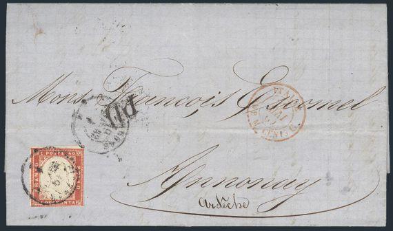 2975 20b image20b, Tied by Florence 19 May 1862 CDS on cover to Annonay, France. Has Turin & cross border transits. F, a bit back panel missing. Scarce. Cat $425 (Image) Estimate 125.00+ $Cdn