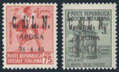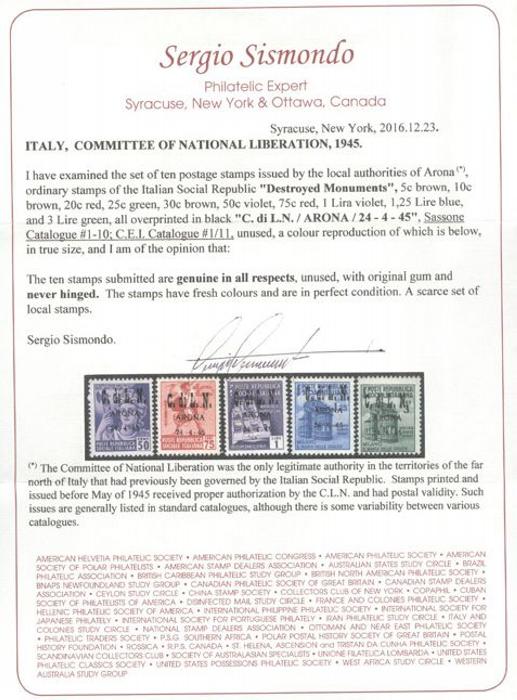 2965 22-31 image22-31, With LOCAL ARONA overprint "C.di L.N. / ARONA / 24-4-45". F-VF, NH (Sassone #'s 1-10). Has 2016 Sismondo Certificate (Image) (View Certificate)