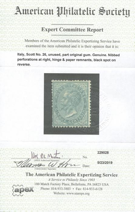mint 5¢ slate green, F, HH, some nibbed perfs, small paper adhesion on reverse. Signed H. Bloch in pencil on back & has 2019 APS Certificate. Scarce stamp (Image) (View Certificate)