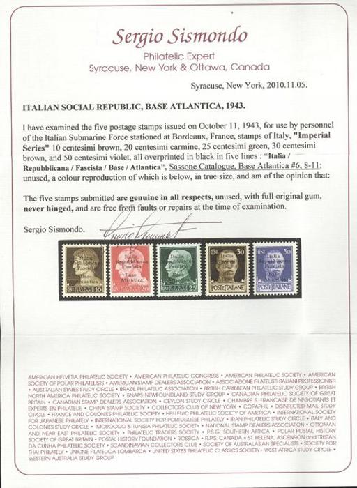 221, With "Italia / Republicana / Fascista / Base / Atlantica" overprints. For use by personel of the Italian Submarine Force at Bordeaux issued 11 Oct 1943. F-VF, NH (Sassone #'s Base Atlantica 6, 8-11). Has 2010 Sismondo Certificate (10¢ has Stolow
