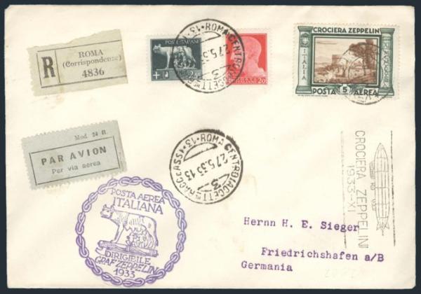 C43 (5L Zeppelin stamp), Neatly tied by Rome 27 May, 1935 CDS's on GRAF ZEPPELIN ITALY FLIGHT cover. Has two diff VF Zeppelin cachets plus illustrated Zeppelin b/s's. VF. A CHOICE ZEPPELIN COVER (Image)
