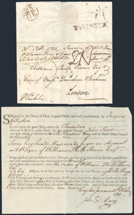 3182   imageStampless folded letter datelined 31 Oct, 1782 with scarce s/l "IAMAICA" h/s. Addr to London England with "23 DE" Bishop Mark. Has Bill of Lading inside for 7 hogsheads of sugar being sent on the ship "Clarendon", with John Shaw as Master. The letter reports they had rain at the plantation lately. F (Image) Estimate 350.00+ $Cdn