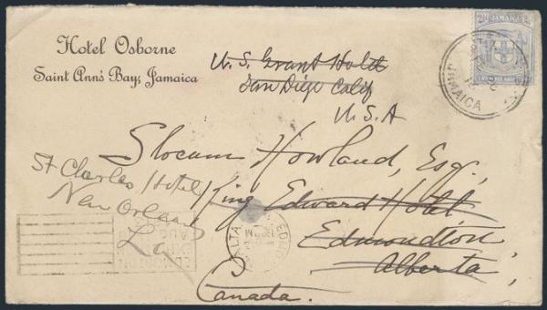 3189 46a image46a, Tied by St. Ann's Bay 28 Feb 1913 CDS on cover with Hotel Osborne corner card. Addr to Edmonton, Alta, redirected to San Diego, Ca, then to New Orleans, 24 Mar Hotel b/s. F (Image) Estimate 50.00+ $Cdn