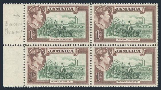 3197 125 image125, Sheet margin block of the KGVI One Shilling pictorial. The UL stamp has the "REPAIRED CHIMNEY" variety. A nice clear example in a positional block of this scarce variety. VF, LH (SG #130a, Cat £698) (Image) Estimate 375.00+ $Cdn