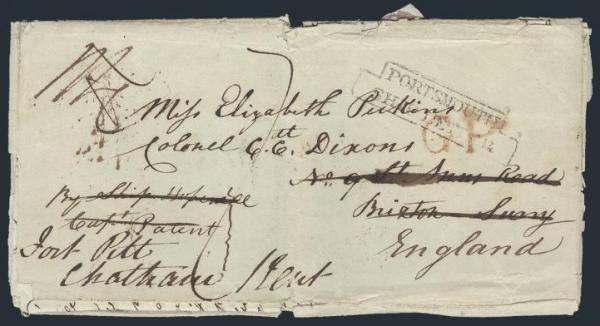 3183   imageStampless folded letter datelined Falmouth Jamaica 11 July, 1837 addr to Brixton England then redirected to Chatham Kent. Has stepped boxed "PORTSMOUTH SHIP LETTER" and numerous transit cancels. The letter is written by a father to his daughter. VG+, bit tatty with some separation (Image) Estimate 200.00+ $Cdn