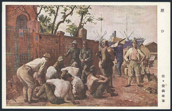 3230   imageCollection of 12 diff unused multi-coloured MILITARY POSTCARDS from WWII era. These depict battle scenes, Japanese troops advancing, harbour occupation, one showing Japanese outside a British Consulate, etc. Scarce group of seldom seen items. VF (Image) Estimate 225.00+ $Cdn