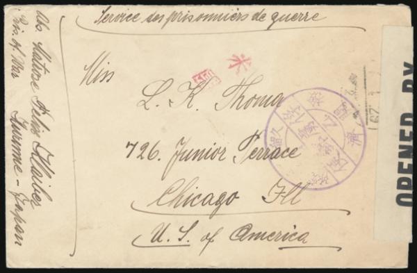 3226   imageWWI stampless cover from a German Prisoner of War in Kurume Japan addr to Chicago USA. Has various Japanese h/s's, m/s 'Service des Prisonniers de Guerre' and tape censor. F (Image) Estimate 225.00+ $Cdn