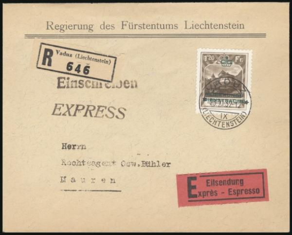 3334 O8 imageO8, XF single neatly tied by Vaduz 23 Nov 1932 CDS on fresh Reg'd Express cover to Mauren (rec b/s). XF. Scott $500 US (Image) Estimate 275.00+ $Cdn