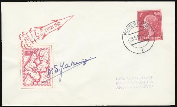 3348 254 image254, Tied by Echternach 23 May 1960 CDS on attractive ROCKET (1st stage) cover addr to Amsterdam. Has red Rocket cachet and signed by Dr. A.J. de Bruijn tying Rocket label (Ellington-Zwisler # 4C1). VF (Image) Estimate 50.00+ $Cdn