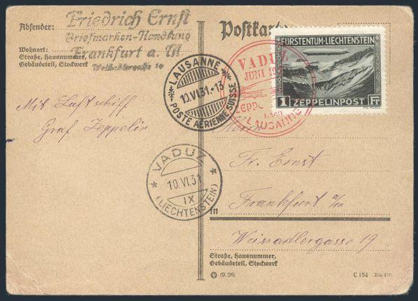 3330 C7 imageC7, Tied on cach GRAF ZEPPELIN Liechtenstein Flight postcard 10 June 1931 to Frankfurt. Has Lausanne transit. F-VF, corner creases. Scarce cover with better franking (Image) Estimate 350.00+ $Cdn