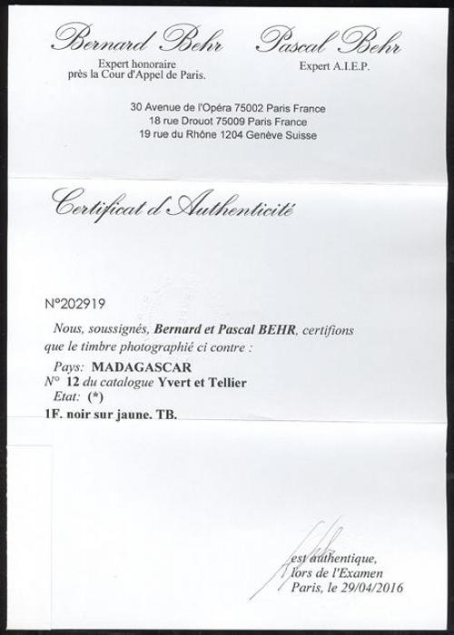 3359 13 image13, Scarce 5Fr High Value, large margins, SON Tamatave 24 Mar, 1892 double-circle cancel. VF. Signed by experts Brun & Roumet and with a 2000 Behr Certificate. Ex Gross. A RARELY OFFERED STAMP (Image) (View Certificate)