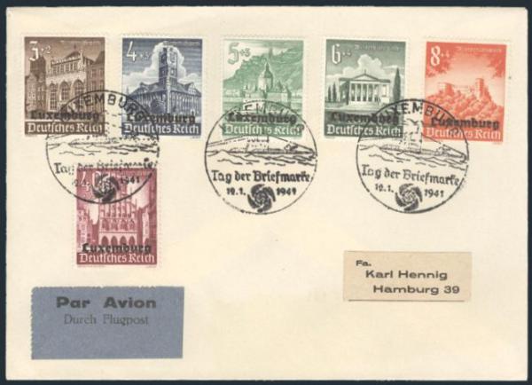 3351 NB1-9 imageNB1-9, Cpl WWII German Occupation set tied by fancy Luxembourg Stamp Day cancels 12 Dec, 1941 (depicting German U-Boats) on 2 airmail covers to Hamburg. VF (Image) Estimate 75.00+ $Cdn