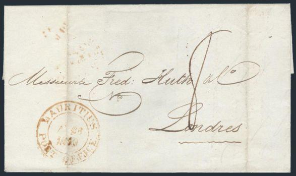 3423   imageStampless folded cover with red double-ring MAURITIUS POST OFFICE 28 Aug, 1840 cancel, rated '8' and addr to London. On reverse has red boxed "INDIA LETTER FALMOUTH". F (Image) Estimate 225.00+ $Cdn