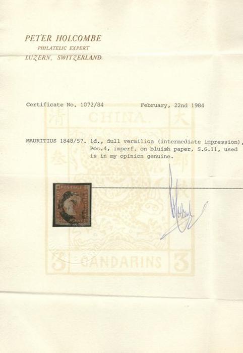 3424 5a image5a, Scarce One Penny Red Orange intermediate impression on bluish paper. Four margins, neat cancel, VF. Has guarantee b/s and 1984 Holcombe Certificate. A RARE CLASSIC STAMP (Image) (View Certificate)